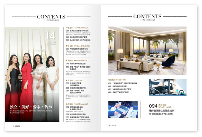 內(nèi)容反映大資管時(shí)代財(cái)富管理全業(yè)態(tài)發(fā)展,突出專(zhuān)業(yè)性和實(shí)用性,同時(shí)兼?zhèn)淙宋年P(guān)懷,雜志密切追蹤國(guó)內(nèi)國(guó)際財(cái)富管理前沿動(dòng)態(tài),深刻解讀財(cái)富管理政策,洞察財(cái)富管理行業(yè)發(fā)展趨勢(shì),揭示產(chǎn)品創(chuàng)新投資渠道,闡釋高品質(zhì)生活方式,倡導(dǎo)健康生活理念,雜志內(nèi)容主要定位財(cái)富管理、高品生活和人文關(guān)懷。