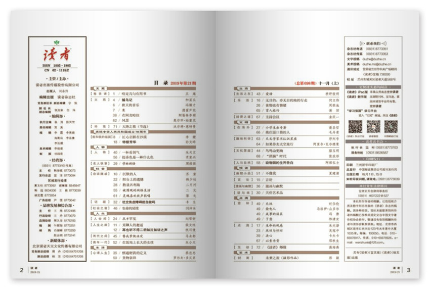 《讀者》創(chuàng)辦于1981年,半月刊,單期84頁,《讀者》是中國具有廣泛社會影響力的著名文化綜合類期刊,封面設計精美,排版簡約大方,內(nèi)容傳遞出濃濃的人文關(guān)懷,深受國人喜愛。