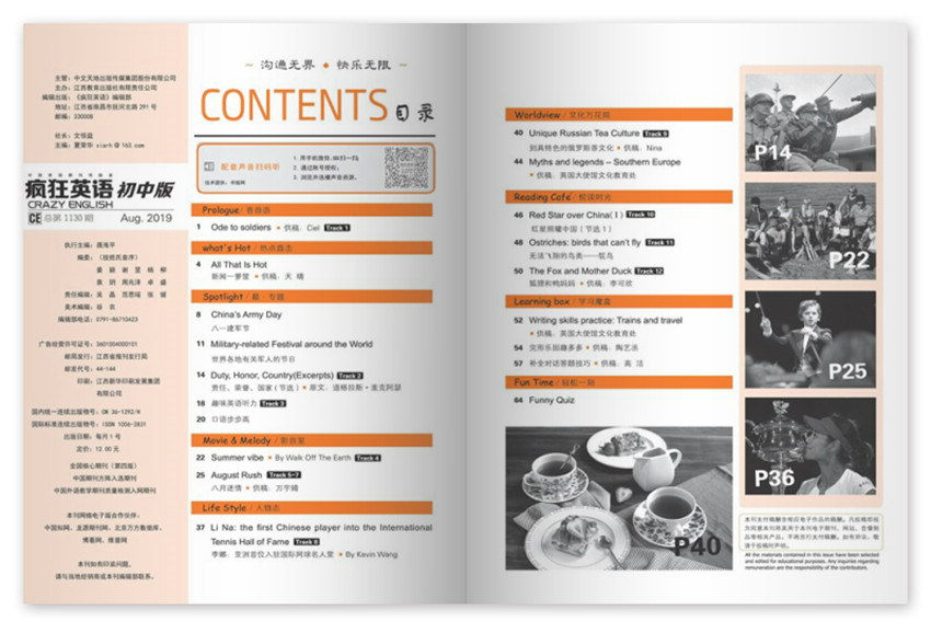 《瘋狂英語(yǔ)》,創(chuàng)刊于1980年,期望通過(guò)自身在傳播領(lǐng)域的資源優(yōu)勢(shì),給我們帶來(lái)高品質(zhì)生活,紙張開(kāi)本:16開(kāi),國(guó)內(nèi)刊號(hào):CN:36-1292/H。為了在英語(yǔ)教學(xué)中弘揚(yáng)深入鉆研、積極改革、不斷創(chuàng)新的精神,為全國(guó)英語(yǔ)教師搭建一個(gè)相互交流和展示其在各自的教學(xué)實(shí)踐、研究領(lǐng)域中所取得的寶貴經(jīng)驗(yàn)和豐碩成果的平臺(tái),大力促進(jìn)中國(guó)基礎(chǔ)英語(yǔ)教育的發(fā)展。