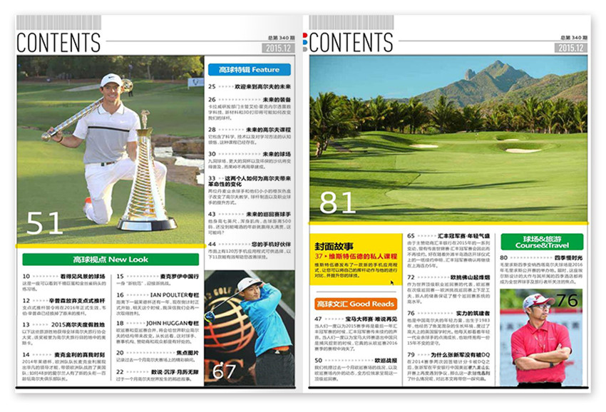 《體育風(fēng)尚·高爾夫大視野》雜志是引進(jìn)國(guó)外高爾夫刊物版權(quán)的國(guó)內(nèi)高球雜志之一,6年的高爾夫類(lèi)雜志管理經(jīng)驗(yàn),是國(guó)內(nèi)具專(zhuān)業(yè)編輯能力的高爾夫?qū)?弧?P> 《體育風(fēng)尚·高爾夫大視野》雜志是國(guó)內(nèi)專(zhuān)業(yè)、純粹的高爾夫?qū)?瑖?guó)內(nèi)訂閱量較大的高球刊物之一。