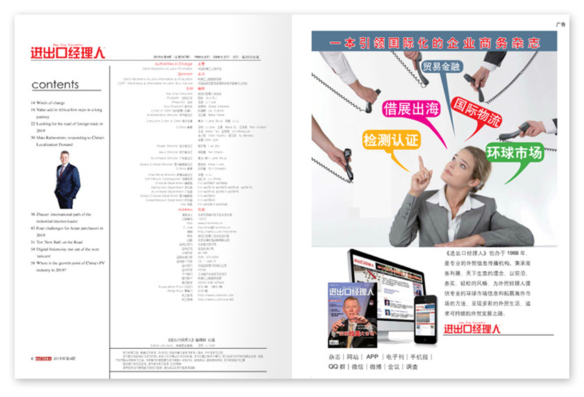 《進(jìn)出口經(jīng)理人》,創(chuàng)刊于1988年,期望通過(guò)自身在傳播領(lǐng)域的資源優(yōu)勢(shì),給我們帶來(lái)高品質(zhì)生活,紙張開(kāi)本:大16開(kāi),國(guó)內(nèi)刊號(hào):CN:11-5491/F。辦刊宗旨:促進(jìn)機(jī)電產(chǎn)品進(jìn)出口和國(guó)際經(jīng)貿(mào)合作;雜志定位:中國(guó)機(jī)電產(chǎn)品領(lǐng)域以外貿(mào)實(shí)務(wù)為核心的綜合期刊。