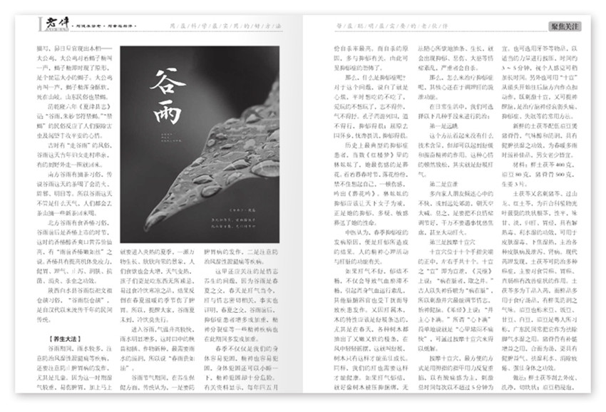 古時有“走谷雨”的風俗,谷雨這天青年婦女走村串親,有的到野外走一圈就回來,南方谷雨有摘茶習俗,傳說谷雨這天的茶喝了會清火、辟邪、明目等。所以谷雨這天不管是什么天氣,人們都會去茶山摘一些新茶回來喝,北方谷雨有食香椿習俗,谷雨前后是香椿上市的時節(jié),這時的香椿醇香爽口營養(yǎng)價值高,有“雨前香椿嫩如絲”之說。香椿具有提高機體免疫力,健胃、理氣、止瀉、潤膚、抗菌、消炎、殺蛇功效。