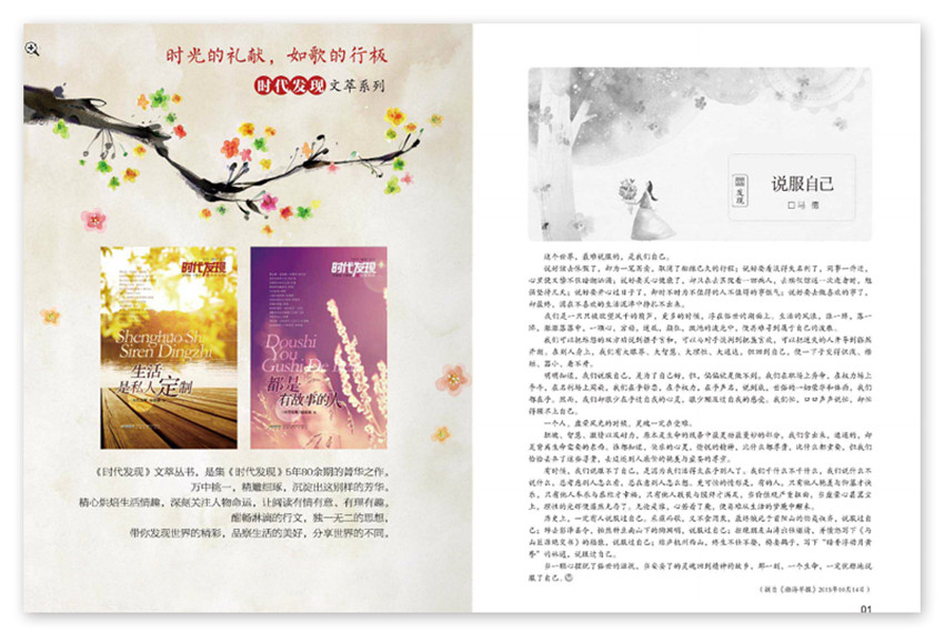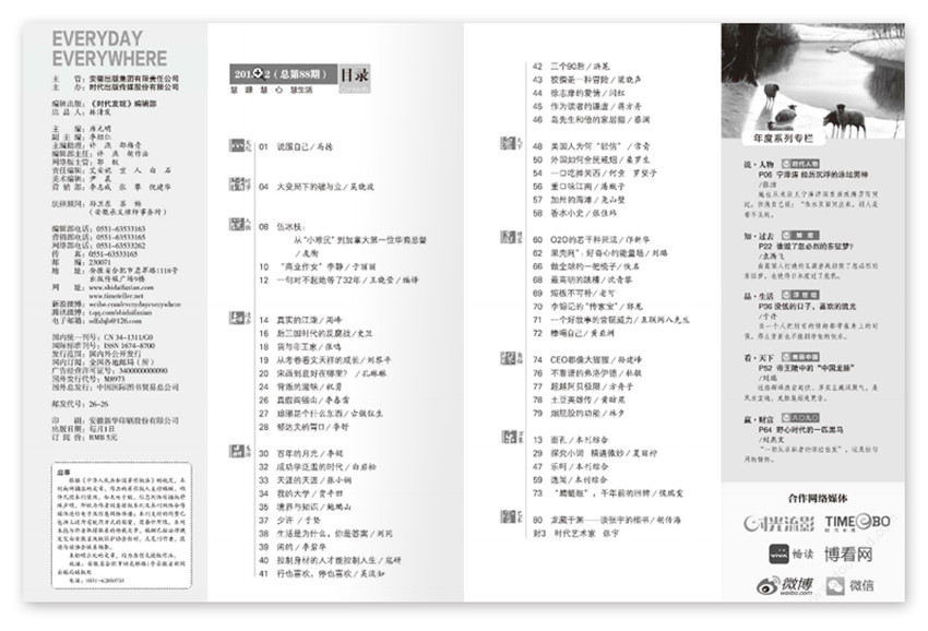 《時(shí)現(xiàn)》雜志以智慧的力量引領(lǐng)生活,以人性的溫暖感號(hào)心靈,以優(yōu)美的文本親近讀者,追求“清爽、清亮、清白、輕松”的風(fēng)格,堅(jiān)持以“快樂(lè)發(fā)現(xiàn)、品鑒生活、涵養(yǎng)心靈”為閱讀的最終價(jià)值取向,共享新的時(shí)代,新的發(fā)現(xiàn),新的生活,新的知識(shí)。