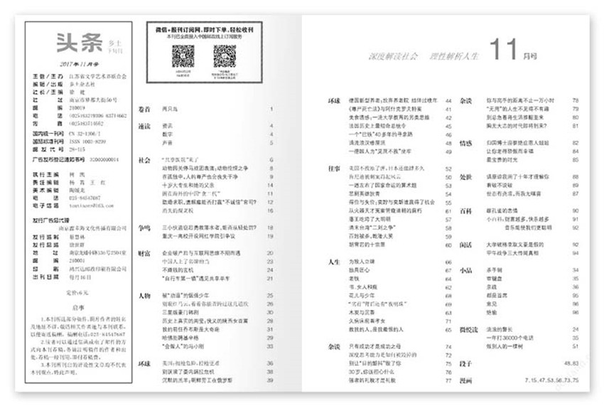 《頭條》創(chuàng)辦于1945年,月刊,單期100頁,《鄉(xiāng)土·頭條》雜志內容涉及社會、人生、人物、文史、海外等各類經(jīng)典文章,傳遞有關為人、立世、創(chuàng)業(yè)、發(fā)展的不朽價值,是你行走社會的生存讀本。