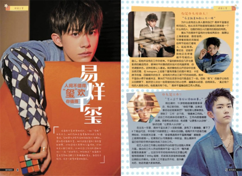 易烊千璽,2000年11月28日生于湖南懷化,中國內地男歌手、舞者、演員,TFBOYS成員,就讀于中央戲劇學院。2005年,首登電視熒屏,開始參演各類綜藝節(jié)目。2009年,加入“飛炫少年”組合,兩年后退出。2013年6月,獲邀加入TF家族;8月,以TFBOYS形式出道,2015年10月,為《小王子》男主角配音,該片刷新法國動畫電影在華票房紀錄。11月,表演自編舞蹈《IFYOU》和《RHYTHMTA》,創(chuàng)下愛奇藝生日會直播在線用戶數據高紀錄。