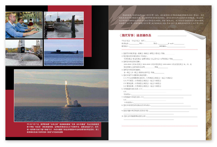 《現(xiàn)代軍事》雜志始終堅持以“傳播軍事信息、普及國防教育、交流軍事技術(shù)、促進武器裝備建設、為國防現(xiàn)代化服務”為辦刊宗旨,以其性、導向性、理論性、前瞻性、可讀性,深受軍事、政治、經(jīng)濟研究人員、軍工貿(mào)人員、部隊官兵以及廣大軍事愛好者的喜愛,已成為國內(nèi)外有影響的、我軍武器裝備與軍事技術(shù)領域的性軍事期刊。