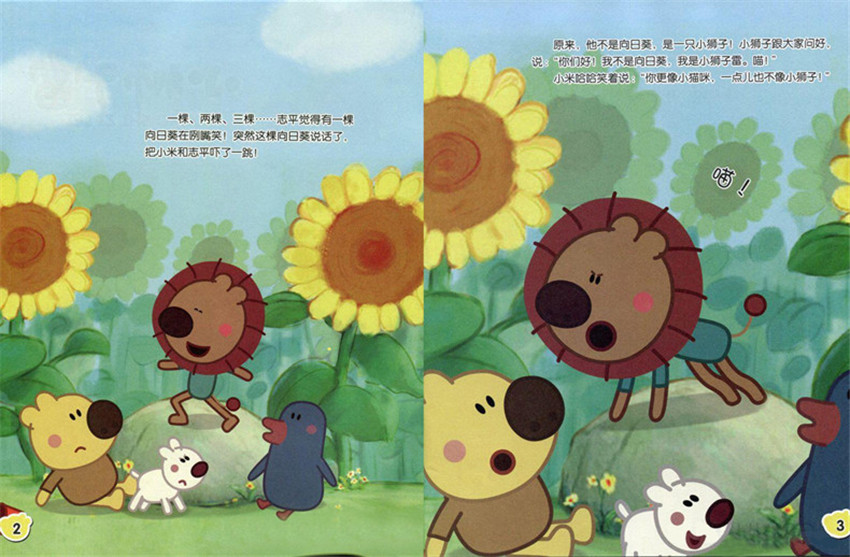 原來,他不是向日葵,是一只小獅子!小獅子跟大家問好,說:“你們好我不是向日葵,我是小獅子雷。喵!”小米哈哈笑著說:“你更像小貓咪,一一點兒也不像小獅子!一棵、兩棵、三棵.志平覺得有一棵向日葵在咧嘴笑!突然這棵向日葵說話了,把小米和志平嚇了一-跳!