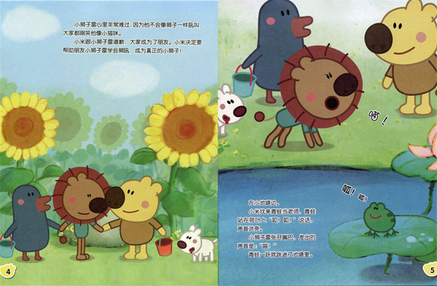 小獅子雷心里非常難過因為他不會像獅子- -樣吼叫,大家都嘲笑他像小貓咪。小米跟小獅子雷道歉,大家成為了朋友。小米決定要幫助朋友小獅子雷學(xué)會獅吼,成為真正的小獅子!在小池塘邊,小來找來青蛙當(dāng)老師,青蛙站在荷葉上呱呱的說話,聲音洪亮。小獅子雷張開嘴巴。發(fā)出的聲音是:喵,青蛙一躍就跳進場池塘里。