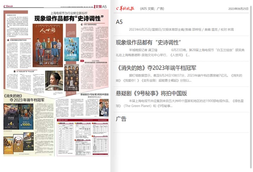 同時,《羊城晚報》還注重文化藝術(shù)方面的報道,關(guān)注與全國相關(guān)的文化活動、展覽、演出等,以及廣州市本土文化產(chǎn)業(yè)的發(fā)展、藝術(shù)家和文化人士的作品展示和推廣,并通過深度報道、人物專訪、活動報道等多種手段,為廣大讀者呈現(xiàn)新穎、獨到的文化藝術(shù)內(nèi)容。