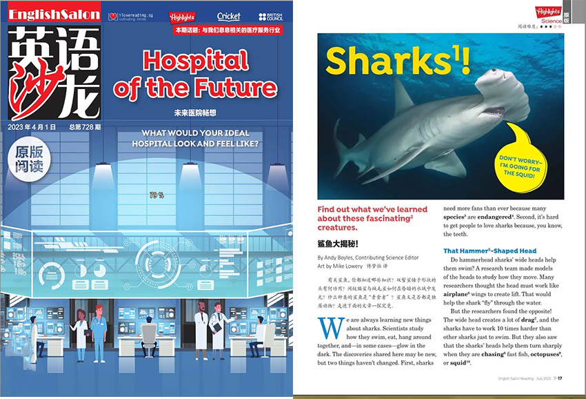 《英語(yǔ)沙龍》主要欄目:HIGHLIGHTS、SOCIAL STUDIES、CRICKET、AMERICAN CAMPUS、BRITISH COUNCIL等。