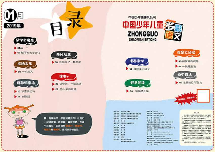 《中國(guó)少年兒童》主要欄目:漢字有魔法、成語(yǔ)大王、詩(shī)歌游樂(lè)場(chǎng)、奇妙故事、課本、畫(huà)中有話(huà)等。