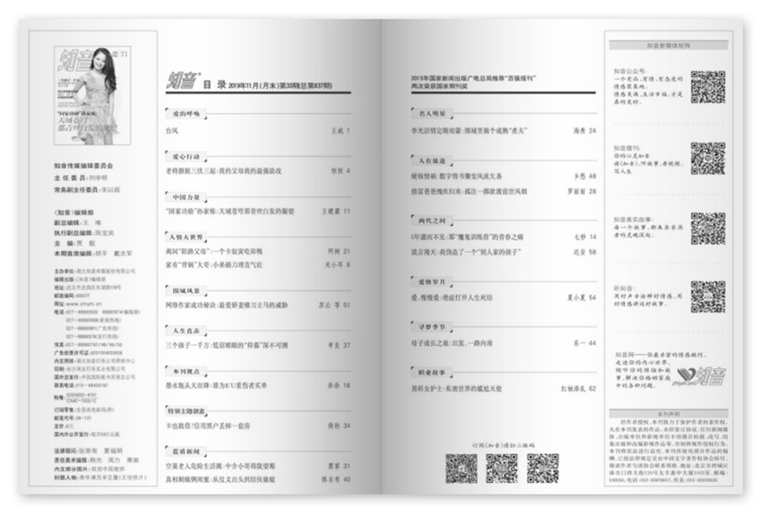 《知音》多層次、多方位、多視角地展示社會(huì)生活中真實(shí)而廣闊的精彩畫面的《知音》,與廣大讀者心心相印,贏得了讀者的真情和厚愛,成為了受讀者歡迎,讓讀者獲得心靈治愈的閱讀雜志。
