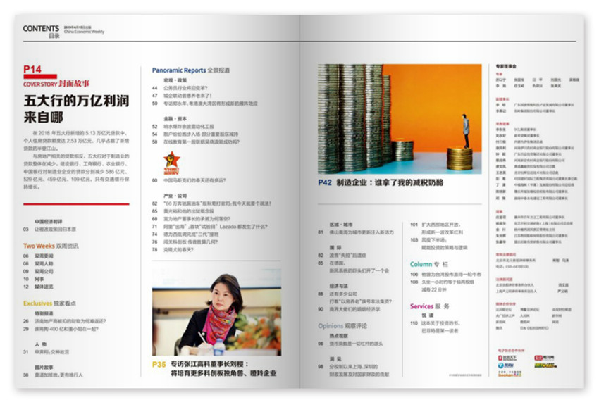 《中國(guó)經(jīng)濟(jì)周刊》主要欄目:中國(guó)經(jīng)濟(jì)時(shí)評(píng)、封面文章、特別報(bào)道、中國(guó)經(jīng)濟(jì)論壇、洞見(jiàn)、區(qū)域、產(chǎn)業(yè)、金臺(tái)銀街。