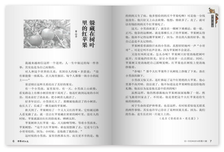 設(shè)有課外閱讀積累、中華國(guó)學(xué)普及、課堂教學(xué)拓展、中高考備考和學(xué)生習(xí)作展示等板塊,以?xún)?yōu)美、正面、高品質(zhì)的選文在中小學(xué)師生中具有良好口碑,以普及傳統(tǒng)文化為特色,以提升文化素養(yǎng)為目標(biāo),分為小學(xué)版,初一年級(jí),初二年級(jí),初三年級(jí),高一年級(jí),高二、高三年級(jí)和教師版七個(gè)版別,供相應(yīng)讀者選擇,主要欄目:花季閱讀、中華國(guó)學(xué)、我寫(xiě)故我在、敘事類(lèi)記敘、文橋閱讀、新題演練等。